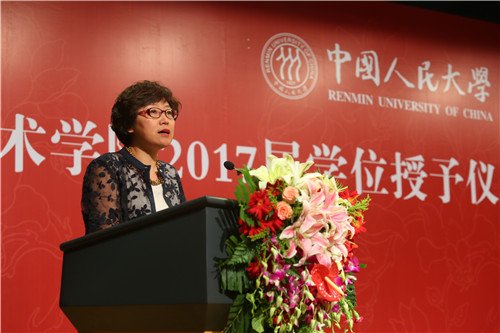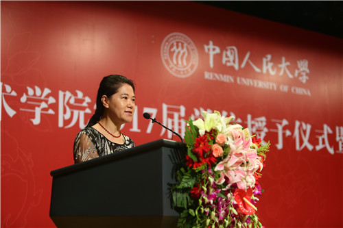 艺术学系马躏非副教授作为教师代表发言,她对毕业生们在校期间取得的各方面成绩表示祝贺与肯定,同时表达了对同学们的深切期许,在临别之际赠送毕业生寄语,期望同学们永葆“三心”:感激之心、敬畏之心、恻隐之心,并做一个诚实、勤劳、成熟的人,做一个对社会有一己贡献的人,人民大学动漫A片