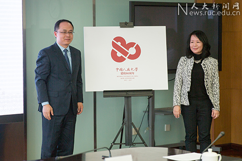 (靳诺书记与校庆标识设计者北京知行堂品牌管理有限公司章叶青校友为校庆标识揭幕)