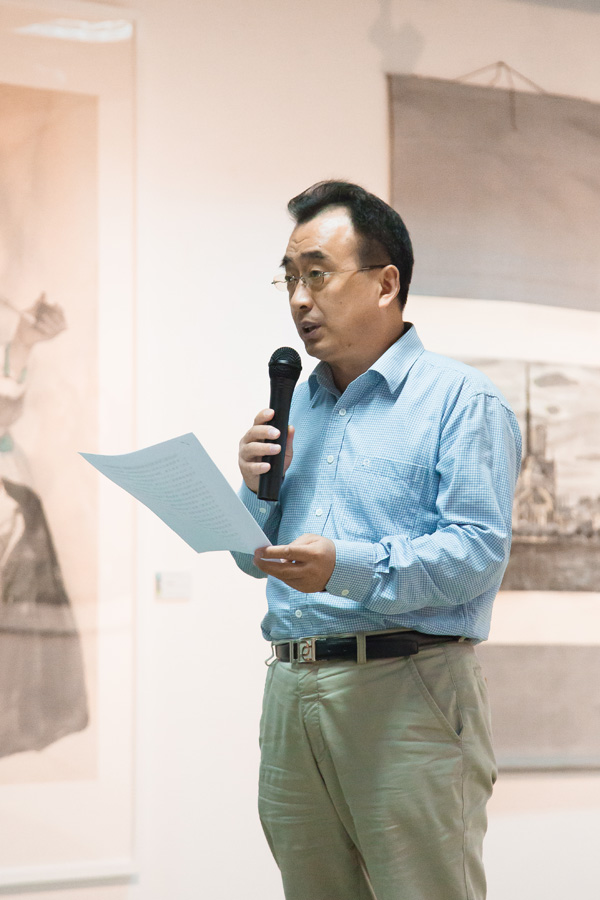 院长助理刘明才副教授、陈浩副教授,绘画系主任黄华三教授、副主任王家增教授,音乐系副主任张放博士,艺术学系主任王文娟副教授,副主任付阳华副教授,徐悲鸿研究院办公室主任赵朝平老师、院办主任钱军老师,教务科长文静老师,学生科长程兰老师,团委书记陈光曦老师等。吴付来副书记、郑工先生、王建书记、徐庆平教授、策展人陈浩副教授、高毅副教授分别在开幕式上致辞。丁方院长在外地出差,特发来了贺信。