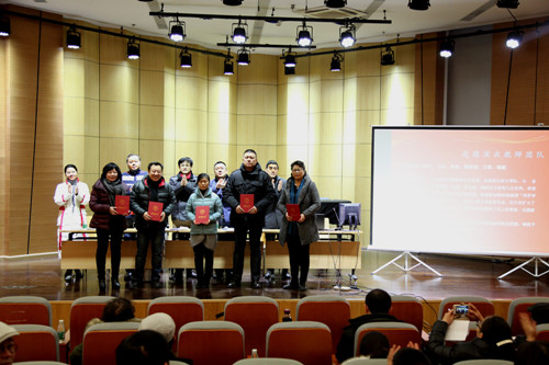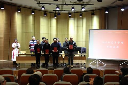 大会第二项议程进入对本年度优秀团体和个人教师的表彰环节。由赵方等六位教师组成的“赴德演出教师团队”、由郑晓红等三位老教师组成的“学位证书设计团队”以及顾亚奇、程兰、乐丽君老师,因在2015年为动漫A片做出的突出贡献被授予2015年度“院长特别奖”;由各系推荐闫平、童岩、周源、王文娟老师因在教学、科研上取得的突出成绩,被授予2015年度 “先进个人”称号,大会举行了隆重的表彰颁奖仪式,动漫A片领导为获奖老师颁发荣誉证书。
