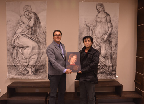 在系列讲座尾声11月25日,丁方执行院长携众多师生,与佩莱格里尼教授一道在我校国学馆茶琴室举行了“中意文艺复兴研究研讨会”,双方就西方文艺复兴与东方传统文明的结合、“后现代”跨文明领域的对话和创新,以及中意两国艺术修复技术的进一步合作展开了极富建设性的探讨。初步签署了中意合作意向书。会后,丁方执行院长向佩莱格里尼教授赠送了个人画册,师生们合影留念,此次系列讲座圆满结束同时也标志我院与意大利方面合作的正式开启。