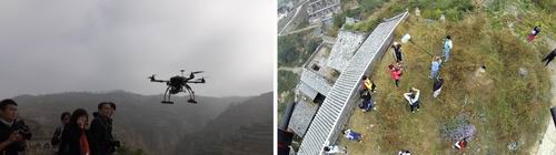 在李家山村上,纵目四望,古色古香,韵味十足的群山窑洞。师生们在雾气环绕的山峦之间,测试航拍数据,收集航拍资料,探索航拍手法。