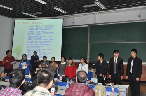 袁先生不时穿插诗歌朗诵,现场气氛热烈。尤其值得一提的是,他和特邀随行的陕西合唱团,特别为观众合作表演了从50年代到80年代的6首青春歌曲——《青年友谊圆舞曲》、《我们年轻人》、《世界是你们的》、《年轻的朋友来相会》、《青春啊青春》及《二十年后再相会》,优美的旋律、美妙的歌声征服着在座的每一位观众,一次次将讲座不断推向高潮。