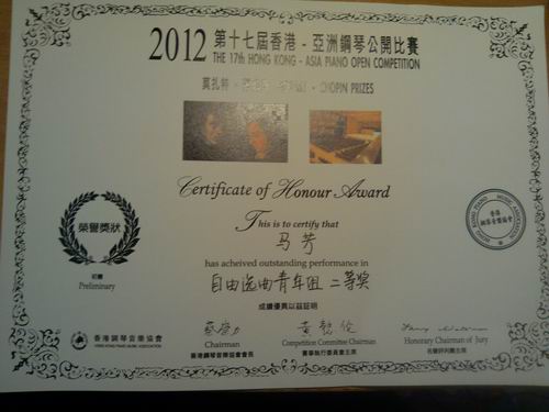 马芳获得“自由选曲青年组”二等奖和“拉赫玛尼诺夫组”三等奖