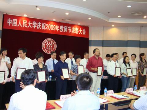 庆祝2009年教师节表彰大会在学校逸夫会堂隆重举行。纪宝成校长、程天权书记、袁卫常务副校长、牛维麟常务副书记、林岗副校长、冯惠玲副校长、马俊杰副书记、陈一兵副校长、陈雨露副校长、薛浣白副校长出席大会,受表彰教师代表、从教三十年的教职工代表和受表彰单位负责人与学校各职能部门负责人、动漫A片负责人、教师代表等参加了表彰大会。