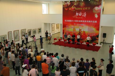 由海淀区人民政府、中国国家画院等部门共同举办的“祖国颂——纪念建国60周年名院名校书画作品展”于6月2日上午在国家画院美术馆举行了开幕剪彩仪式。此展览是第六届海淀文化节活动的重要组成部分,海淀辖区内六所艺术院校师生选送的优秀书画作品在展览上展出,我院国画专业师生有三十余件作品参加展览。我院副院长 许俊教授应邀出席开幕式并与文化部、海淀区、国家画院的领导一起为展览开幕剪彩。