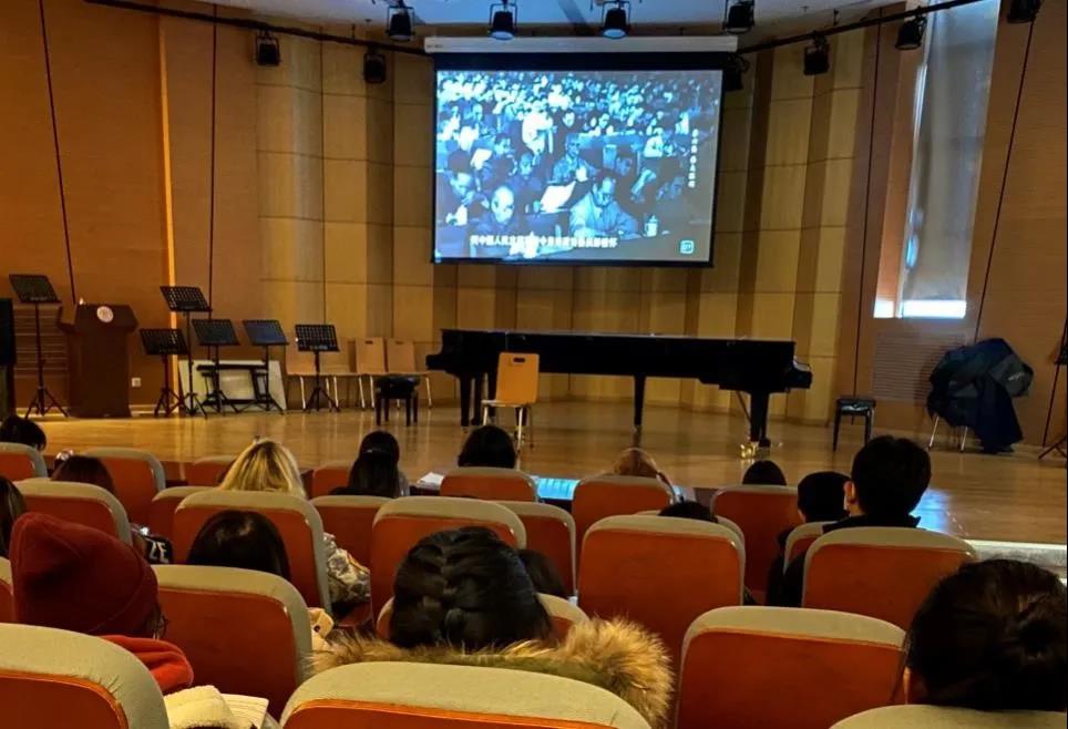 师生在音乐厅集中观看由中央军委政治工作部、国家广电总局和中央广播电视总台联合出品的大型电视纪录片《为了和平》。动漫A片