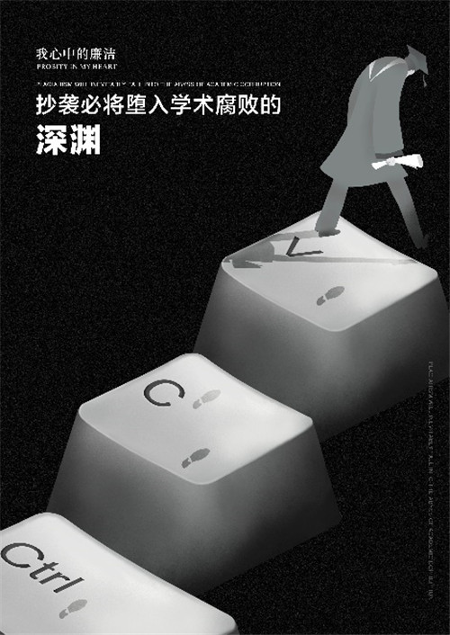 师生在视觉化呈现廉政建设主题中,将对公权变为谋取私利的工具的批判具化为可感的物象符号,深化了防微杜渐、拒腐防变的主题表达。作为高校学生,作品尤其关注学术腐败现象,并期待从规范机制的角度杜绝学术不端、营造风清气正的治学氛围。