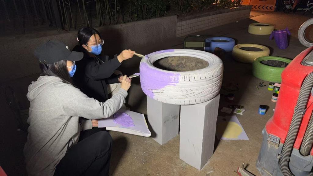 在实践过程中,同学们通力协作,连夜完成轮胎和背景板底漆刷涂,确保色彩的饱满持久和艺术效果的最终展现。社区的小朋友们也在同学们的指导下参与到轮胎涂色中,增添了更多童趣与活力。
