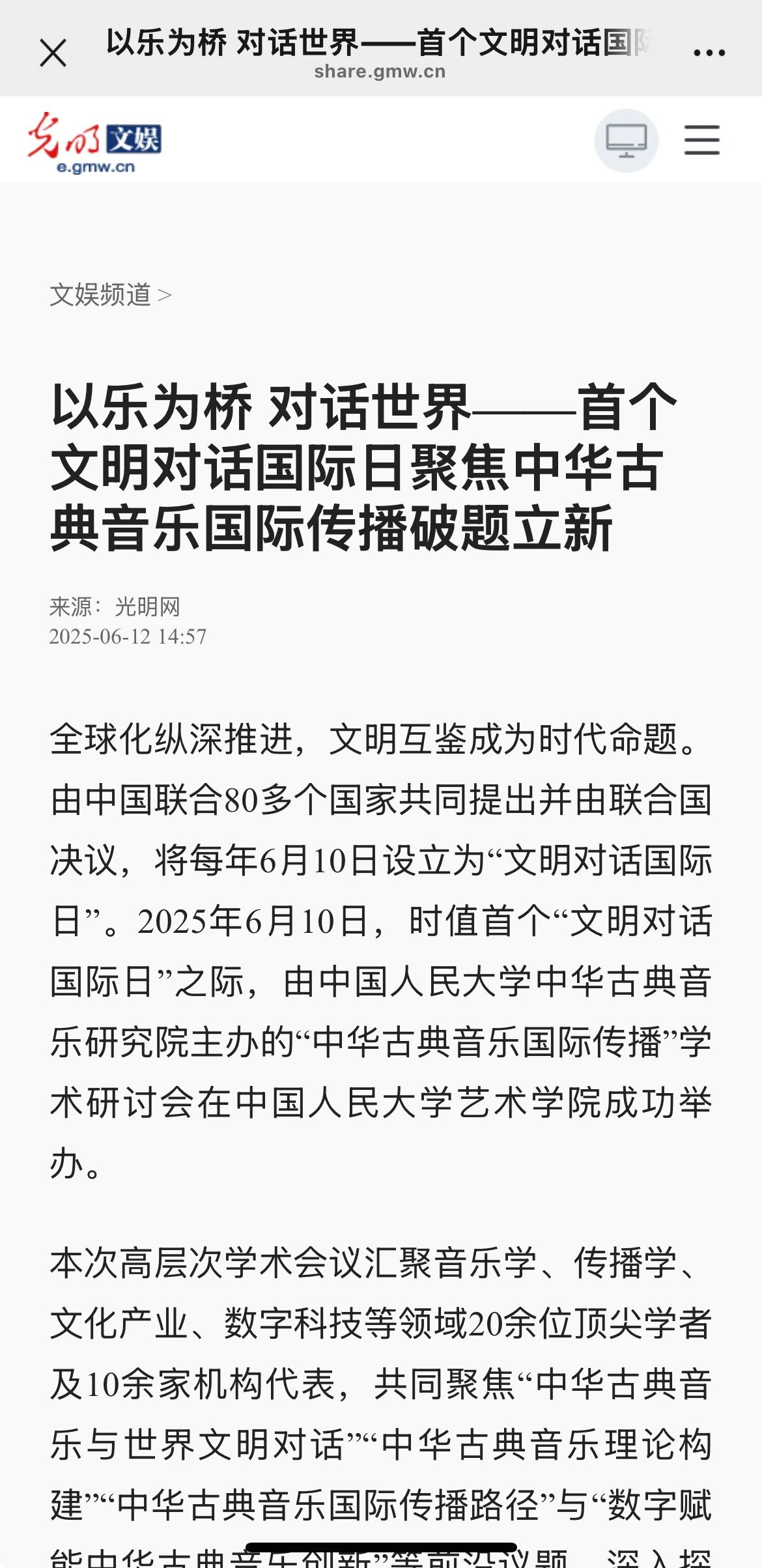 成功举办。本次研讨会汇聚了音乐学、传播学、文化产业、数字科技等领域的20余位顶尖学者及10余家机构代表,共同聚焦“中华古典音乐与世界文明对话”“中华古典音乐理论构建”“中华古典音乐国际传播路径”与“数字赋能中华古典音乐创新”等前沿议题,探讨中华古典音乐的国际传播与创新发展。光明网等多家媒体参会报道。