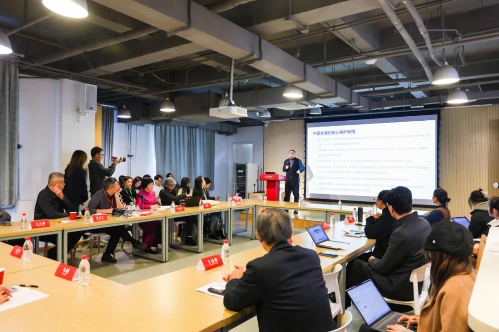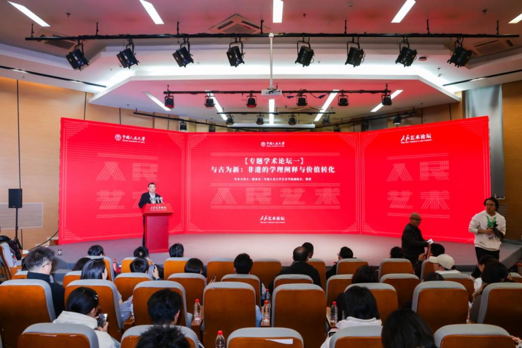 院长张淳主持。多位来自全国文艺与非遗领域的学者与嘉宾围绕“非遗融入现代生活”主题发表演讲,从不同学科视角阐释非遗保护与创新发展的多维路径。中国文联副主席潘鲁生作题为《中国非物质文化遗产保护的基本原则》的演讲,从四个方面系统梳理了非遗保护工作的理念框架与实践经验;北京印刷动漫A片院长田忠利以《以出版与设计之力,构建“非遗活化”的创新生态》为题,从出版美学出发,探讨出版设计在推动非遗传播中的转化作用;北京舞蹈动漫A片院长许锐以《中国传统民族民间舞蹈的当代转化》为题,分享了表演艺术类非遗的创新路径;清华大学人文讲席教授杭间以《“非遗”与当代创新》为题,从学术角度深入分析了非遗在保护传承中“守正”与“创新”的关系;依文集团董事长夏华以《释放民族文化原力,让世界看见中国文化之美》为题,展示了非遗在产业振兴与国际传播中的现实意义;中国工艺美术大师、国家级非物质文化遗产景泰蓝制作技艺代表性传承人钟连盛以《景泰蓝艺术的当代创新应用》为题,分享了景泰蓝的制作工序、发展历史以及传统技艺的转型实践成果。专家的演讲共同勾勒出非物质文化遗产在当代从“固本”到“求新”,再到“赋能”的清晰发展蓝图。