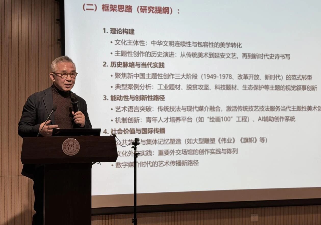 在开题论证研讨环节,黄华三教授就课题总体情况进行汇报。他简要介绍了课题的研究思路、核心概念、总体框架、重点问题及阶段性实践成果。重点阐释了课题关于探索新时代主题性美术创作经典作品可能生成路径的理论思考,深入剖析研究的时代价值与实践意义。