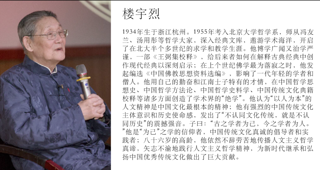 楼宇烈,1934年生于浙江杭州。1955年考入北京大学哲学系,师从冯友兰、汤用彤等哲学大家,深入经典文库,遨游学术海洋,开启了在北大半个多世纪的求学和教学生涯。他博学广闻又治学严谨,一部《王弼集校释》,给后来者如何在解释古典经典中创作现代经典以深刻启示;在上个世纪佛学最为落寂之时,他发起编选《中国佛教思想资料选编》,影响了一代年轻的学者和僧人。他用自己的勤奋和江南士子特有的才情,在中国哲学思想史、中国哲学方法论、中国哲学史料学、中国传统文化典籍校释等诸多方面创造了学术界的“绝学”。他认为“以人为本”的人文精神是中国文化最根本的精神;他有强烈的中国传统文化主体意识和历史使命感,发出了“不认同文化传统,就是不认同历史”的震撼强音。子曰:“古之学者为己,今之学者为人。”他是“为己”之学的信仰者,中国传统文化真诚的倡导者和实践者;八十六岁的高龄,他依然不辞劳苦地传播人文主义哲学真谛,矢志不渝地践行人文主义哲学精神,为新时代继承和弘扬中国优秀传统文化做出了巨大贡献。