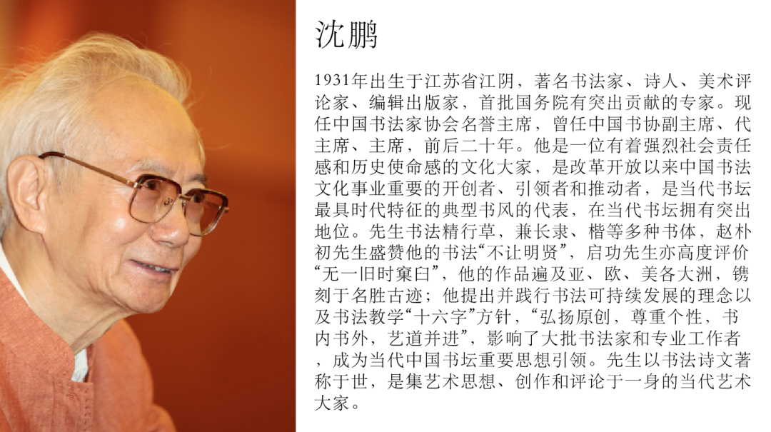 沈鹏,1931年出生于江苏省江阴,著名书法家、诗人、美术评论家、编辑出版家,首批国务院有突出贡献的专家。现任中国书法家协会名誉主席,曾任中国书协副主席、代主席、主席,前后二十年。他是一位有着强烈社会责任感和历史使命感的文化大家,是改革开放以来中国书法文化事业重要的开创者、引领者和推动者,是当代书坛最具时代特征的典型书风的代表,在当代书坛拥有突出地位。先生书法精行草,兼长隶、楷等多种书体,赵朴初先生盛赞他的书法“不让明贤”,启功先生亦高度评价“无一旧时窠臼”,他的作品遍及亚、欧、美各大洲,镌刻于名胜古迹;他提出并践行书法可持续发展的理念以及书法教学“十六字”方针,“弘扬原创,尊重个性,书内书外,艺道并进”,影响了大批书法家和专业工作者,成为当代中国书坛重要思想引领。先生以书法诗文著称于世,是集艺术思想、创作和评论于一身的当代艺术大家。