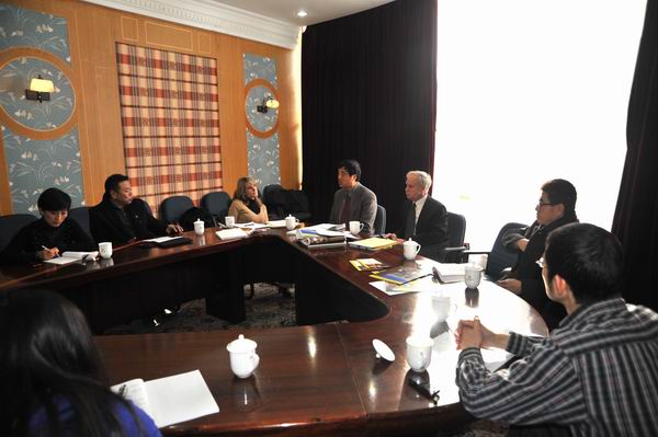 王英健副院长、赵方副院长、设计系主任祝东平、文化艺术策划工作室负责人王鹏与来访的美国瓦尔帕莱索大学(Valparaiso University) 副教务长、研究生院院长David Rowland一行在逸夫第四报告厅进行了友好的合作会谈。瓦尔帕莱索大学孔子动漫A片的美方院长孟剑云教授、瓦尔帕莱索大学Catherine Gibson教授以及动漫A片