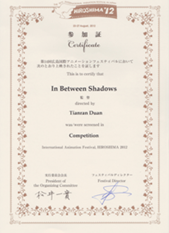 2012年8月底,我院艺术设计系教师段天然实验动画作品“In Between Shadows”入围第14届广岛国际动画节竞赛单元。广岛国际动画节为全球四大动画电影节之一,1984年由国际动画协会ASIFA创立,以“和平和友爱”为电影节的创办宗旨。本次电影节有来自全球2000多部作品参赛,共有66部入选竞赛单元。