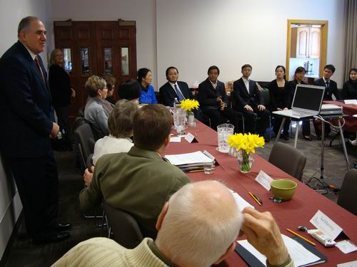 赵方教授率演出小组与美方学校董事会交谈