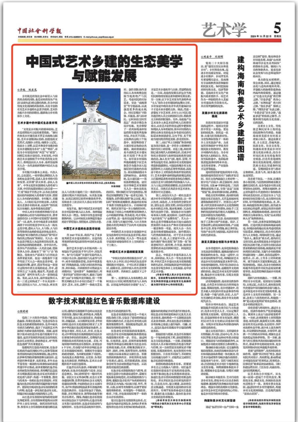 “文化是乡村振兴的精神基础,艺术是凝聚振兴力量的重要载体。”新时代和美乡村建设离不开艺术的助力赋能,艺术乡建强调以美的、创造性的文艺形式,挖掘乡土特色、唤醒乡土记忆、焕新乡土文明。以艺术和美学为媒介的艺术乡建既能为乡村“上色”“增彩”,亦能为乡村创造好的“风景”与“前景”。回顾已有的乡建经验,不难发现,中国的艺术乡建根植于中华优秀传统文化沃土,体现出以以人为本、桑梓情谊和天人合一为代表的鲜明的中国式生态美学观。