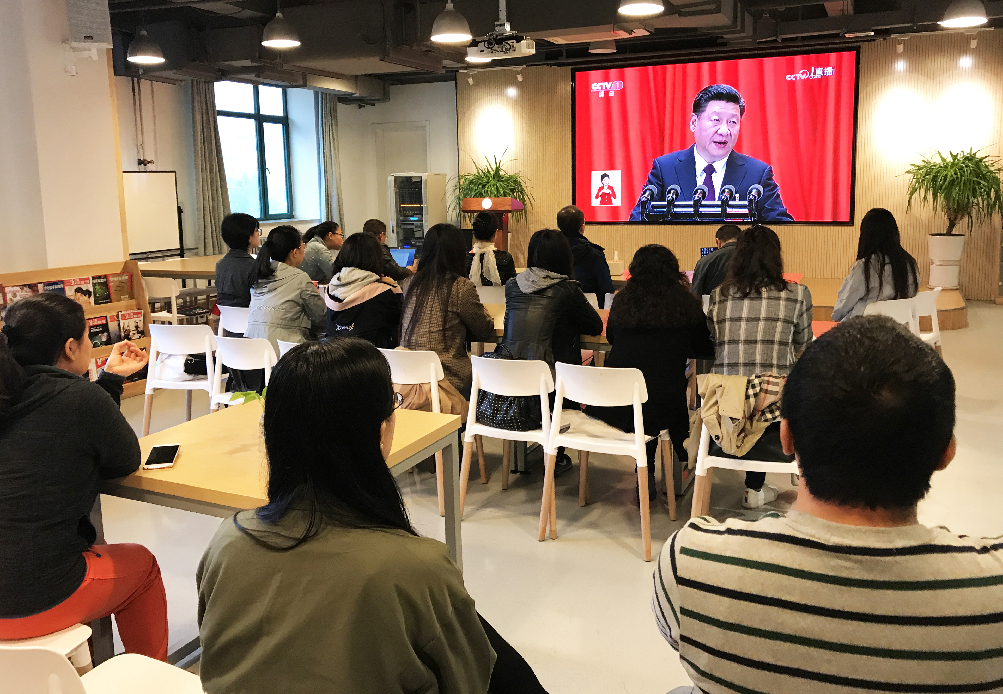 党总支副书记别敏、教工一支部书记刘明才、教工二支部书记陈炯、学生一支部书记乔侨、学生二支部书记黄月丽及师生党员、部分教职工在动漫A片教师发展中心集体收看了十九大开幕会直播盛况。