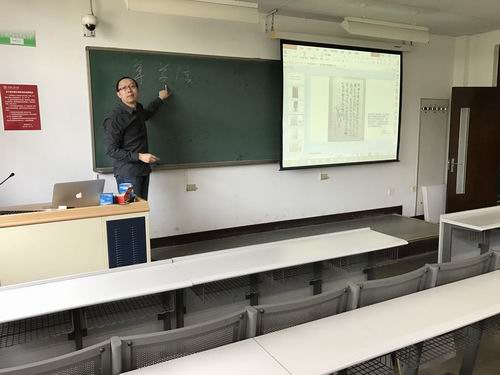 之后,刘明才老师对毛泽东的诗词书法作品进行了具体细致的赏析讲解,从其用笔特色,结字特点溯源至同怀素、张旭、王羲之等历史上大书法家作品的比照分析。通过毛泽东诗词、书法所展现出的开阔宏大、纵意流动的气象,引申出对作者人格气度、广博胸襟的认识与思考。从“诗言志”到“心若不坚,字无劲健”“心正则笔正”进而谈到中国传统文化所强调的“人品与艺品的统一”。刘明才老师还通过对毛泽东墨迹手书的解读,分别示例解析了一些典型汉字的篆书、草书写法。面对当今越来越多的人不能释读前人书作的实际情况,刘老师提醒同学们要加强中国传统文化的学习研究,鼓励同学们自觉承担起中华民族文艺传承的伟大使命。并激励同学们求学做事以“正心、诚意”为本,开拓自己的心胸,认识自己的心性,努力探索,为民族文艺的伟大复兴贡献一己之力。