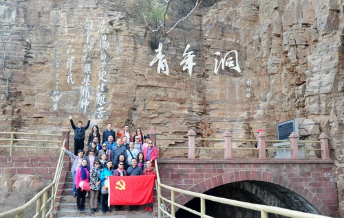 4月10日上午,一行赴红旗渠实地参观,徒步两小时前往红旗渠主要工程之一的青年洞。红旗渠是人工修建的灌渠,位于河南、山西、河北三省交界处。渠首引自浊漳河,全长1500多公里,是当年林县人民在极其艰难的条件下,以愚公移山精神,历时十年,绝壁穿石,挖渠千里,从太行山腰修建的引漳入林工程。在修建过程中,林县广大人民不畏艰难,一共踏平了1250座山头,钻透了211个隧洞,架起了152座渡槽。随后,教职工党员参观了红旗渠纪念馆,了解了当年林县人民修筑红旗渠的历史背景,通过观看图片、实物和纪录片资料,教职工党员身临其境地感受到林县人民建造人工天河时不畏艰险、顽强拼搏、撼天动地的恢弘场景,为“自力更生、艰苦创业、团结协作、无私奉献”的红旗渠精神所震撼。