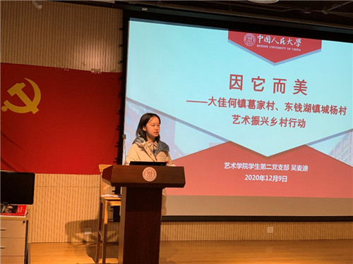 学生第二党支部钱艺、吴麦迪分别以艺术乡建、艺术振兴乡村为主题,讲述了艺术如何推动乡村发展。法动漫A片2020级法律硕士二支部以发扬新时代焦裕禄精神、“心系民众、笃行务实”为主题展开汇报,表示青年学生应不