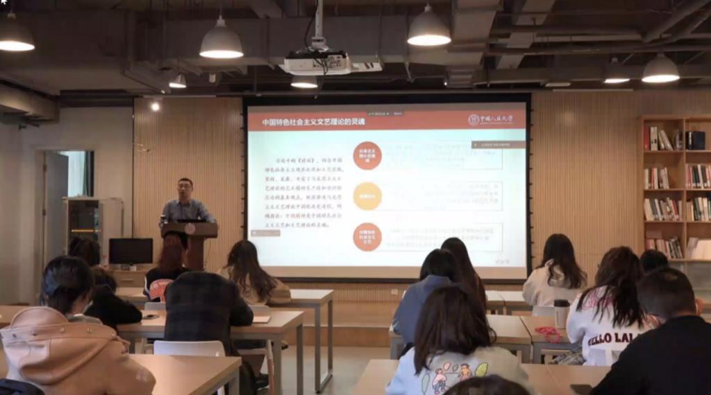 顾亚奇教授从一张记录延安文艺座谈会的老照片入手,带领同学们重返历史现场,从1942年延安文艺座谈会,到习近平总书记在文艺工作座谈会上的重要讲话精神,“人民性”是两次讲话一脉相承的核心命题。在文艺实践的过程中,我们应尽可能秉持人民立场,凸显人民的主体地位;厚植人民情怀,饱含对人民的深厚情感;创作精品力作,满足人民精神文化需求;坚持社会效益优先,让人民成为艺术评判的主体。最后,顾亚奇教授又提醒同学们认真学习6月2日习近平总书记于文化传承发展座谈会上发表的重要讲话,勉励同学们在新的起点上继续推动文化繁荣、建设文化强国、建设中华民族现代文明,坚定文化自信、担当使命、奋发有为,共同努力创造属于我们这个时代的新文化。