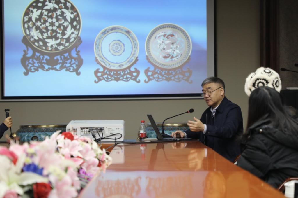 传承记忆,超越历史。会议室中,钟连盛大师向在座师生作了以“景泰蓝艺术的起源、传承和创新发展”为题的讲座。钟连盛大师将景泰蓝文化以“挽救,恢复”、“传承,发展”、“开拓,创新”三个篇章展开,介绍了景泰蓝发展的历史和现状。