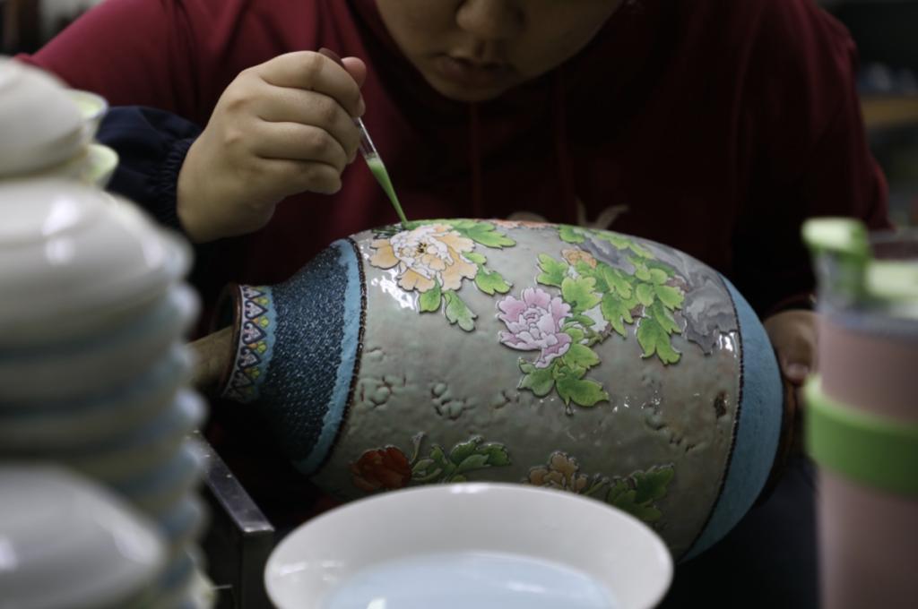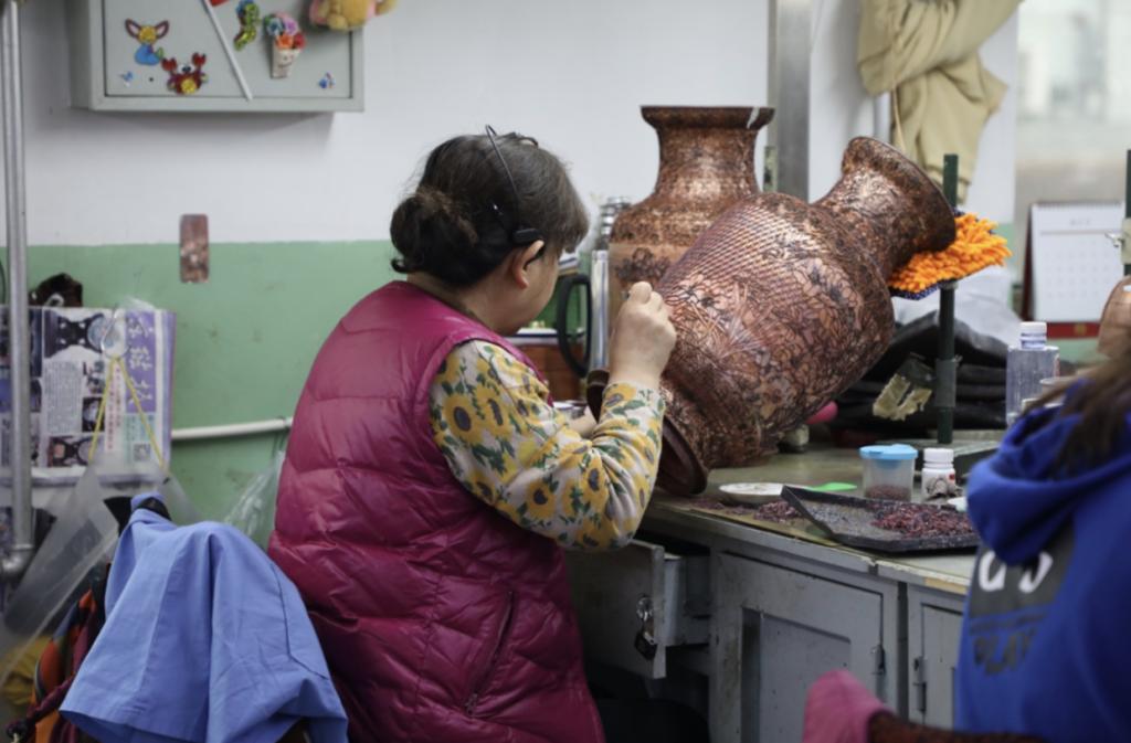 随后,师生们跟随钟连盛大师步入制作车间,观察景泰蓝工艺品的制作原料、空间以及制作过程,并深刻体会到精致的景泰蓝作品所承载的精益求精的匠人精神、百年传承的极致工艺,以及老工艺在新时代传承精华、不断革新的发展之道。