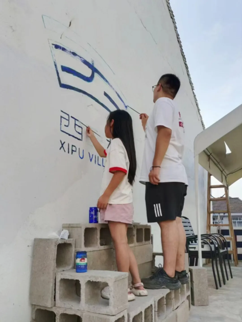 结合村民经验,他们设计的美学角落样板使用了当地较为常见的空心砖和瓦片。他们还充分考虑“打卡式旅游”的特点,制作了满足“打卡+休息”需求的“花园石椅”,邀请小朋友们一起将西圃村的logo画在墙上。