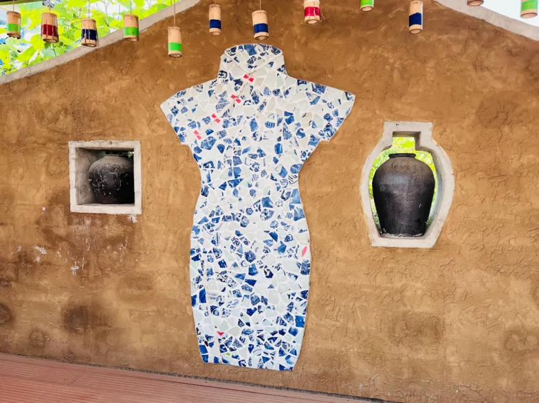 2024年7月,跨越1400公里的距离,即将读研的王艺馨和王汝灏第一次跟随团队来到西圃村,加入了这场创建美学角落的奇妙之旅。从宁波火车站驱车一路向南,稳稳停在这座曾以制陶闻名的村庄。群山之间,古村之中,陈列着很多团队成员之前与村民们用碎瓷片共创的作品。