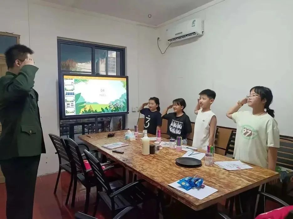 在八一建军节这天,作为退役军人的王汝灏穿上军装与孩子们重温军史,教他们敬军礼,还策划了《童心筑梦·荣耀致敬》专题美育课,带着孩子们用艺术创作的方式向军人致敬,在孩子们心里种下了第一颗“美学”种子。