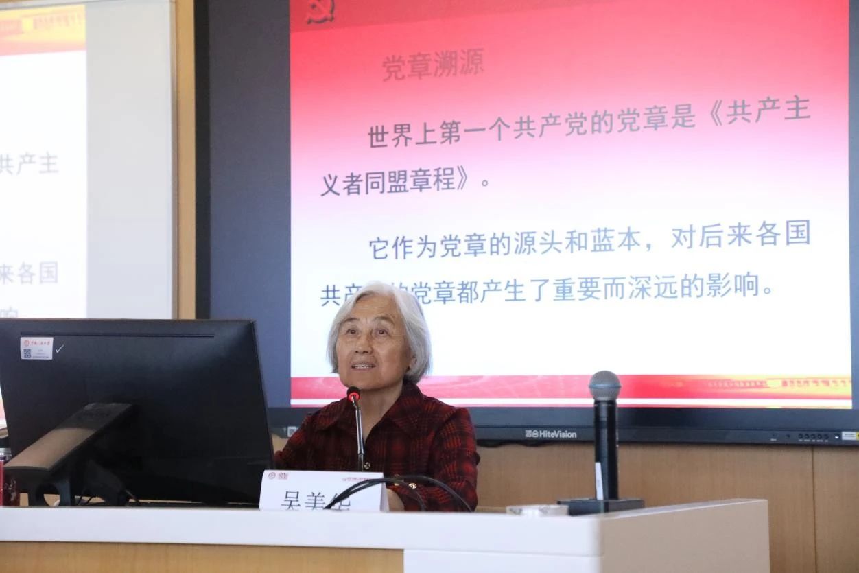 党委书记付春梅主持。吴美华教授从《中国共产党章程》的起源谈起,梳理了党章的发展历程与修改亮点,并指出学习党章必须将其放到世界社会主义运动、中国近现代史和中国共产党历史的大背景下,才能全面准确地理解和把握其百年发展的历史脉络和主要内容。