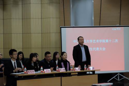 第十二次学生代表大会在音乐厅召开,校团委副书记李晰老师、校学生会主席周元恺同学、动漫A片党总支书记王建副教授,副书记别敏副教授,团委书记、本次大会秘书长陈光曦老师,团委学生副书记翁雨晴以及动漫A片