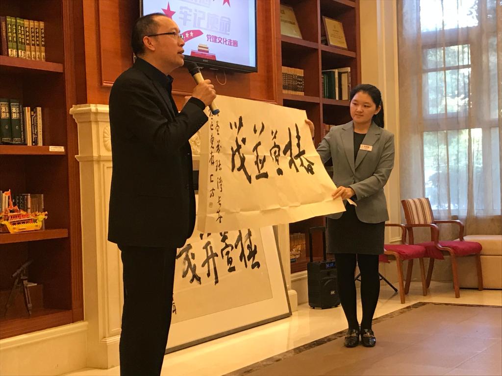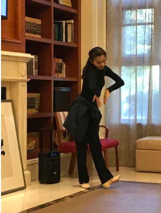 温馨而欢乐的慰问活动在教工一支部党员、校艺术教育中心副主任费佳的主持下正式拉开帷幕,院党总支副书记别敏致辞,并深情朗诵毛主席诗词《采桑子·重阳》,营造出一幅清丽明媚的深秋画卷。杨洁老师以宛转酣畅的舞蹈《翻身农奴把歌唱》,把白发婆娑的老人们带回到激情四射的青春年代;费佳老师和刘琉老师合作完成的《吐鲁番的葡萄熟了》以热情洋溢的旋律将大家置身于瓜果飘香的葡萄园中;周源老师领唱《夕阳红》,以深沉辽远的歌声表达对椿萱茂长者们最真诚的祝福。最后,五位八十岁高领的椿萱茂老人合奏《彩云追月》、《歌唱祖国》、《友谊地久天长》等口琴作品,令现场所有人动容。院副院长、教工一支部书记刘明才老师向老年公寓捐赠了他新近创作的大字行草书“椿萱并茂”匾额,刚劲沉郁的书作赢得了全场热烈的掌声。