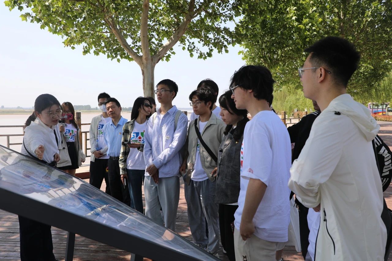 随后,实践团队来到黄河十八弯的最后一弯——东坝头,感受母亲河的波澜壮阔。团队成员站在毛泽东主席1952年视察时驻足的观河亭,在讲解员的讲述中,队员们了解了“宽河固堤”与“调水调沙”两大治黄方略,通过眺望河岸边绵延的生态廊道建设示范段,让同学们深切体会到退耕还湿、生态护坡等综合治理成效。这场跨越时空的眺望,既让青年学子感受到“黄河宁,天下平”的历史回响,更在新时代的绿色堤防与麦浪间,深刻体悟到中国共产党人“要把黄河的事情办好”的初心传承。