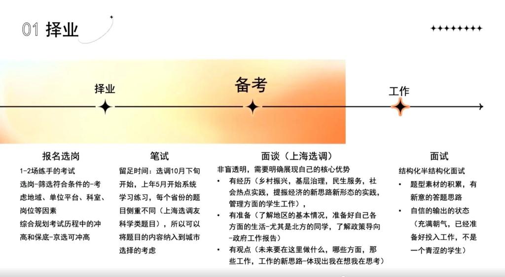 随后,赵师姐分享了她的报名与考试历程,并特别强调了报名选岗的重要性。她讲到,报名选岗是一个关键环节,应通过多种渠道深入了解各地选调生政策的差异,避免因信息不对称而错失良机。具体选岗时,首先筛选出符合自己专业和学历要求的岗位,然后再结合地域、单位发展前景等因素进行综合考量。