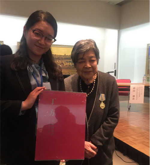 将丁方院长作品集赠送给平山郁夫夫人平山美知子,其刚刚荣获阿富汗方面颁发的荣誉勋章