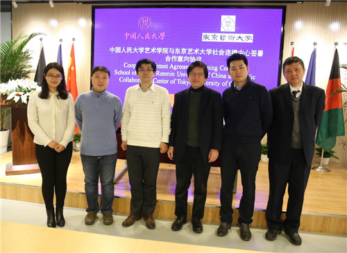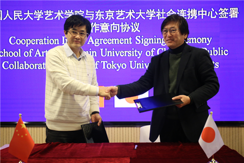 In the context of “The Road and Belt” Initiative and “The Road and Belt” Education Action Plan, on January 23rd,2017, School of Arts RUC signed a cooperative agreement with The Public Collaboration Center of Tokyo University of the Arts. A long-term cooperation will be conducted in the areas of academic research, field investigation, Art conservation and restoration, talent training and international exhibitions etc. which is aimed at promoting the development of cultural industry, expand the popularization of Chinese culture, introduce foreign leading art resources and cutting-edge technologies, deepen academic exchange between China and Japan. Prof. DING Fang, the Dean of School of Arts RUC and Prof. Takashi INOUE as representatives of each party signed the agreement.
