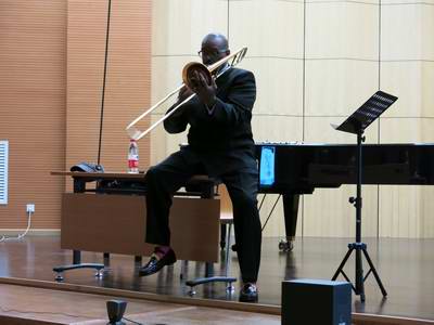 丹尼斯·威尔逊教授此行在音乐厅为师生举办了“贝西伯爵”讲座,讲述了一代美国爵士乐大师贝西的一生,同时现场演示了长号在装上不同辅助工具后多变的音色,现场气氛热烈,同学们不仅感受到爵士乐的当代魅力,更体会到它悠长又富有传奇色彩的历史以及爵士乐对美国文化所产生的影响。