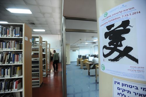 展览期间,在特拉维夫大学校园,书法展海报随处可见。校园里洋溢着一股浓浓的中国文化气氛