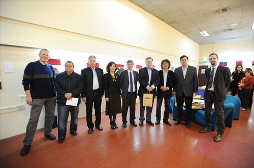 出席开幕式的嘉宾:中国驻以色列大使馆教育处负责人姜言东(右2)、特拉维夫大学常务校长、汉学家谢爱伦(Aron Shhai)(右4)、 特拉维夫大学外事副校长莱茵瑞(Raanan Reon)(右5)、特拉维夫大学学生事务副校长欧永福(Yoav Ariel)(右8)、动漫A片
