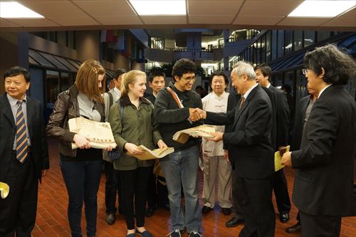 开幕酒会上徐庆平院长代表动漫A片向乔治城大学东亚系同学赠书法学习用品