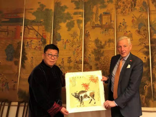绘画系花鸟画家吴冰副教授创作一幅代表中国传统文化的中国画作品。吴冰老师将唐代五牛图与加拿大红枫叶元素相结合,用传统的中国画形式加以表现。大使收到这件礼物后非常高兴,回复道:“感谢吴先生,我已经把这幅精美的作品装裱好,挂在我办公室的显要位置。”