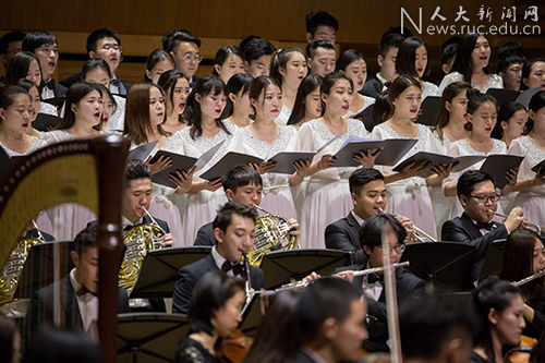 在《春节序曲》明快热烈、亲切动人的演绎之后,伴随着合唱团悠扬的吟唱,由校友、作曲家吕骥根据郭沫若同名诗歌于1941年创作而成的交响合唱《凤凰涅槃》,将《序曲》《凤歌》《凰歌》《群鸟歌》《凤凰更生歌》五个乐章有机统一在郭沫若纵横驰骋的雄浑诗篇中,创造性地实现了“诗歌与音乐”的结合。歌唱家杨明明和谢天激昂震撼的演唱,更是唤起了在场师生对人民大学八十载峥嵘岁月的深情回忆,激发出后辈学子对老一辈革命家的真挚情感。现场观众心潮澎湃,掌声如潮。