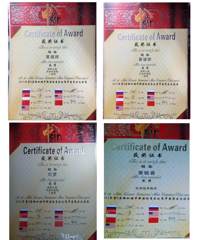音乐系钢琴专业学生在中新国际音乐比赛中荣获一等奖