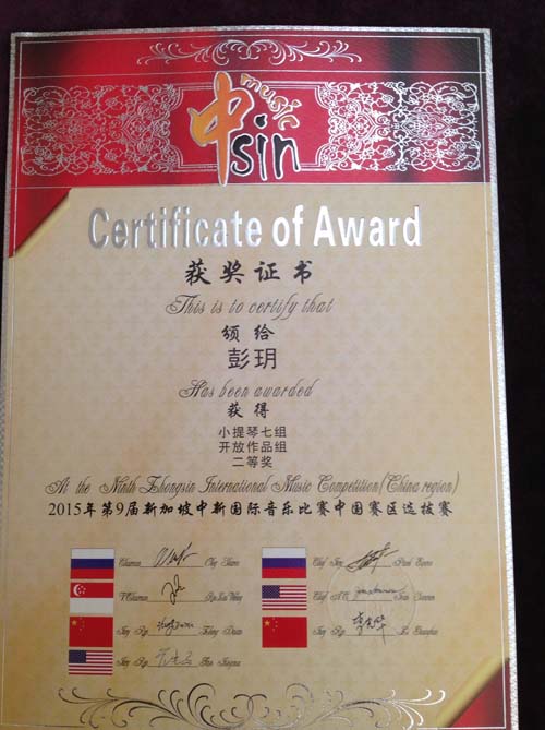“第九届新加坡中新国际音乐比赛中国赛区选拔赛”日前在北京举行。我院2014级音乐表演专业本科生彭玥获得开放作品组二等奖的佳绩,并将于20152月份前往新加坡参加决赛。彭玥的主要指导老师为我院音乐系副教授程亚威。