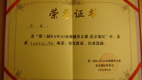 音乐系马龙同学在KAWAI亚洲钢琴大赛中获奖