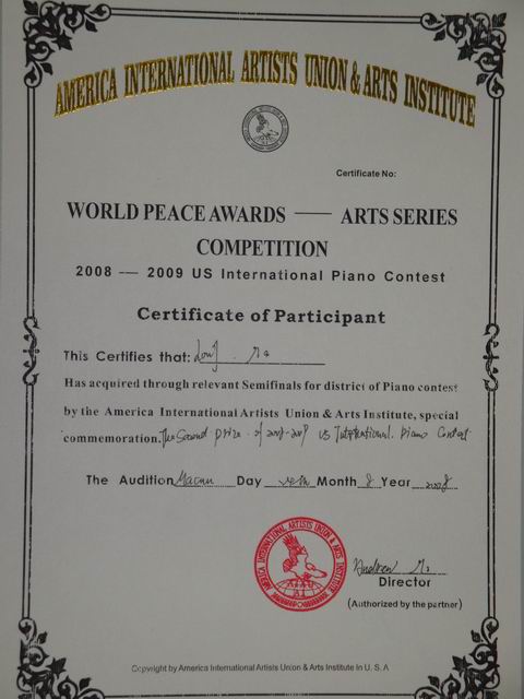 近日,我院音乐系07级马龙同学赴澳门参加由美国艺术家联合会及艺术研究会与中国《小演奏家》杂志社共同举办的“世界和平奖美国国际钢琴大赛(亚太地区)”半决赛,与来自亚太地区各国以及中国各城市获复赛资格的选手们同场竞技。经过激烈的角逐,荣获专题组二等奖的好成绩,为我院争得了荣誉。钢琴主科指导教师:康毓春。