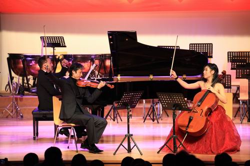 本场音乐会由动漫A片 音乐系李莉、刘向前主持。包括室内乐重奏、交响乐、声乐表演等多种形式,所选曲目既有莫扎特、门德尔松、乔治·比才、维托里奥·蒙蒂等的西洋经典名曲,也有冼星海、殷承宗、储望华、王洛滨、施光南等的中国经典曲目,让我们在辞旧迎新之际,深深品味馨享了经典的艺术魅力。赵越、阎彬彬、于金禾等十二名学生组成的女生小合唱《乘着歌声的翅膀》及《青春舞曲》拉开了音乐会的序幕;音乐系2014级王胜宇、孙少秋所奏的门德尔松单簧管《音乐会二重奏》节奏轻快,让大家的心情跟着音符起舞;杨毅老师演唱的《多情的土地》、2011级学生李秉璇男低音独唱《大江东去》、以及杨明明、杨毅老师带来的男女生二重唱《让我们携手同行》真挚动人,令观众心潮起伏;程亚威老师的小提琴独奏《查尔达什舞曲》优美动人、引人入胜;张放、程亚威及王莹三位青年演奏家为观众带来了门德尔松的《第一钢琴三重奏》,他们以精湛的演奏和绝佳的配合征服了所有观众。最后由音乐系2012级学生刘博文、黄安若演奏、动漫A片 音乐系青年交响乐团协奏的钢琴协奏曲《黄河》将整场音乐会推向高潮:黄河以它英雄的气魄象征着我们民族的精神,《黄河》以它史诗的篇章激荡着每一颗观众的心!